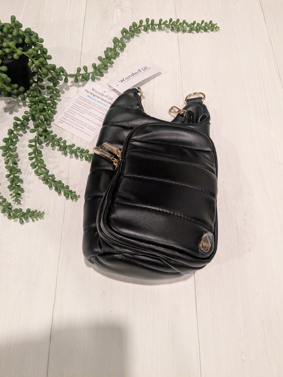 Stay hands-free and hydrated wherever you go with this patent-pending HydroBag, the original stylish water bottle bag. Designed for everyday adventures, it offers both utility and flair: Holds bottles up to 3.5" in diameter (compatible with 24 oz to 34 oz bottles from Owala, HydroFlask, Stanley, etc.) Two zippered pockets — outer for your phone, inner for passport, cards, AirPods, and more Water-resistant lining protects your essentials from leaks or condensation Adjustable 2" strap distributes weight for comfort Quilted “Puffer Coat” fabric in glossy black with gunmetal hardware Interchangeable black, white, and gray striped guitar strap Dimensions: 11" H × 5" W Care: spot clean recommended (gentle machine wash only in emergencies) A big thank you to Vicki for this chic, functional donation!