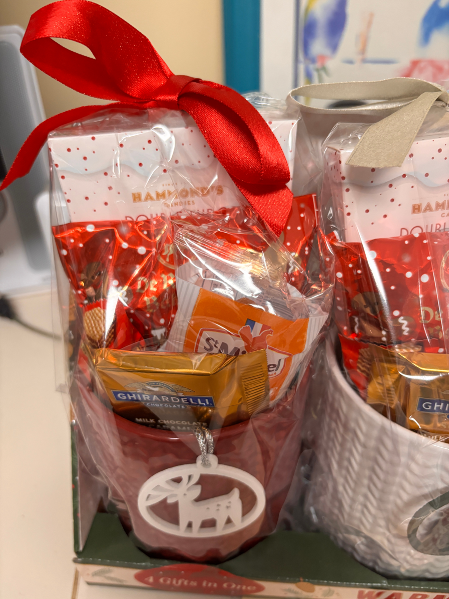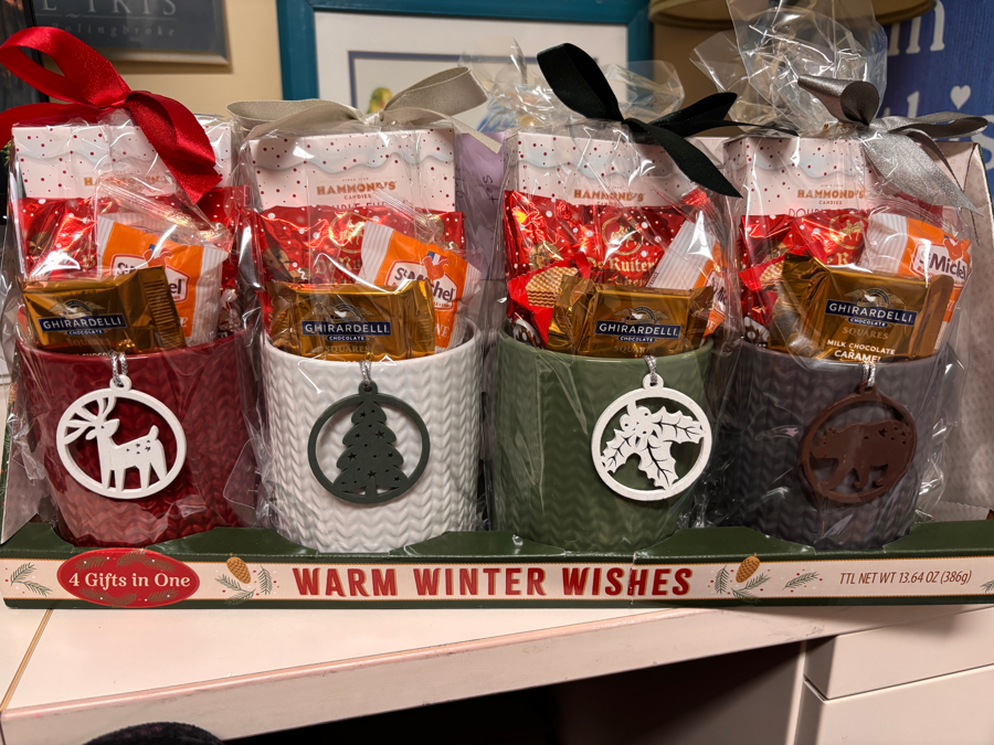 Great for gift giving! Beautiful, large mugs filled with an assortment of yummy treats and decorated with a cute ornament. Each mug is wrapped separately so you can easily cross off four people from your gift list. Great for teacher gifts!