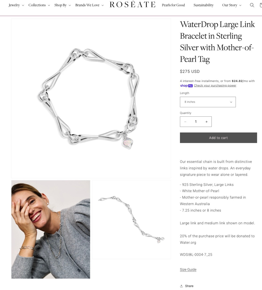Sterling silver bracelet: - 925 Sterling Silver, Large Links - Mother-of-pearl tag - 7.25 inches or 8 inches - Mother-of-pearl responsibly farmed in Western Australia - 20% of purchase price doanted to Water.org