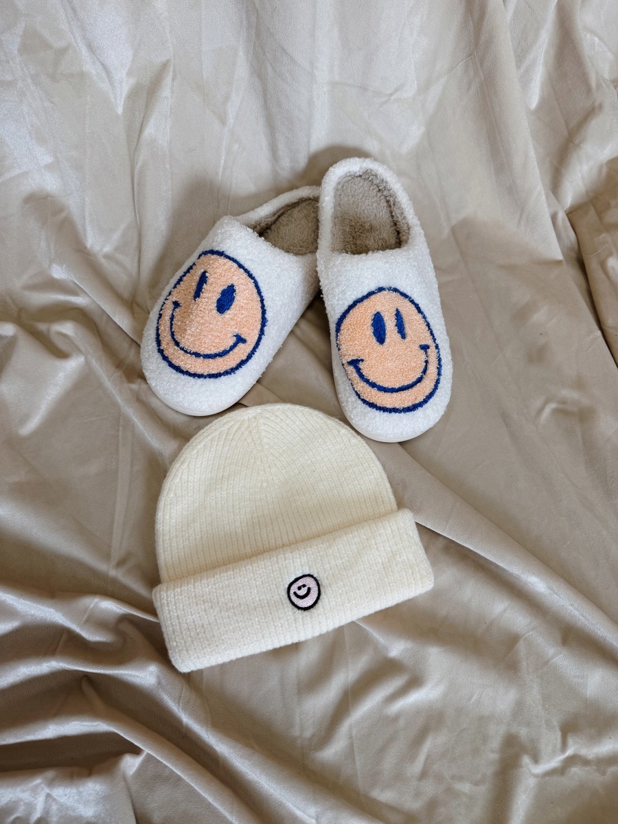 Smiley Fuzzy Slippers Size M ( Women’s 7/8) and Smiley Beanie to keep you warm. Donated by Opal and Onyx Clothing. Find them at Opalandonyx.com