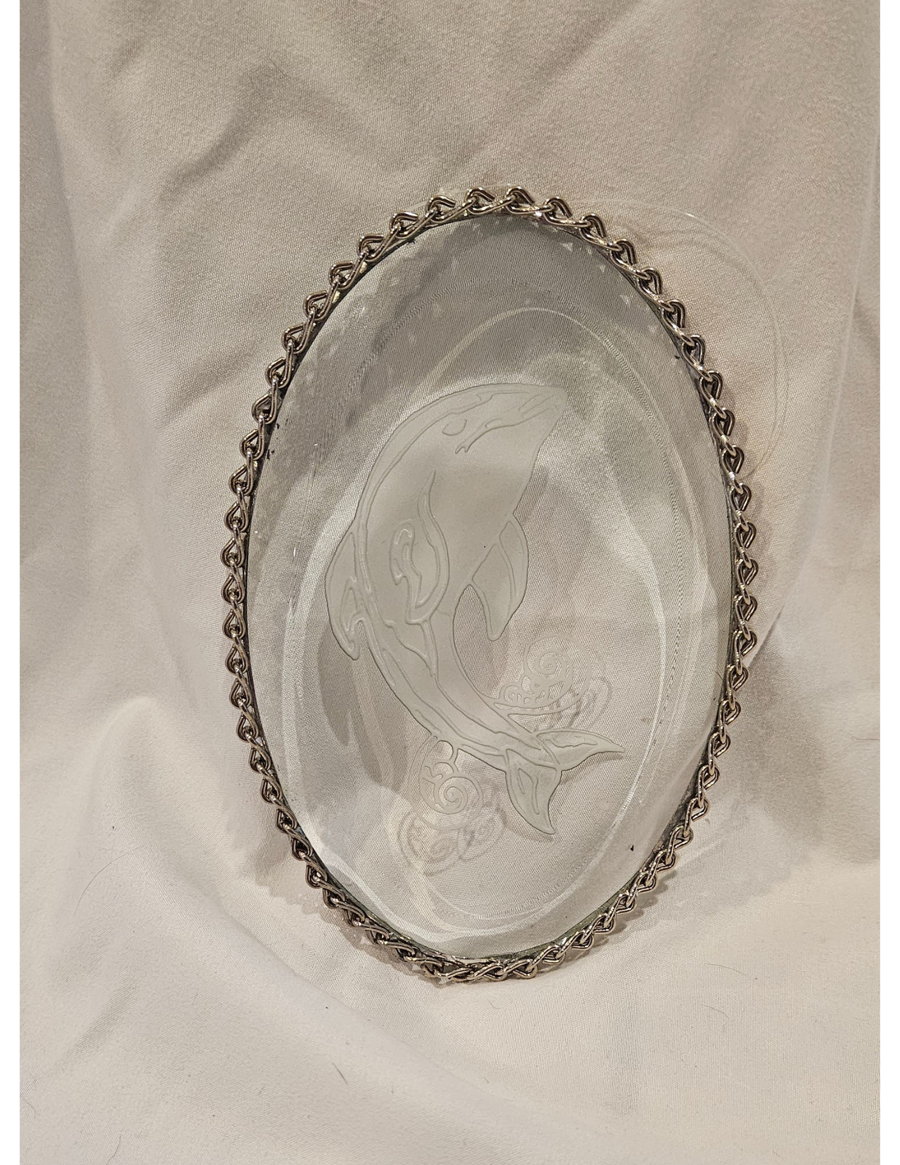 Handmade 6in beveled stained glass piece with engraved whale and chain-link border by Christine Harte