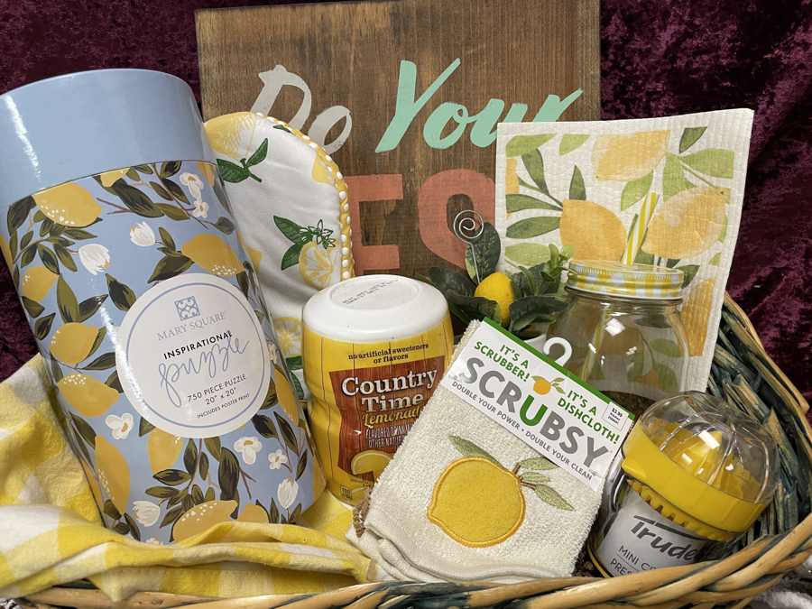 #1030 - This cheerful kitchen gift set features a mason jar–style glass with lid and straw, a small faux lemon plant, and a handy scrubby. It also includes an inspirational puzzle, a yellow checked tea towel, a lemon-themed hot pad glove, a lemon/citrus hand juicer, and a wooden plaque with the uplifting message: “Do Your Best”—perfect for adding a bright, motivational touch to any kitchen. New items / Not redeemable for cash.