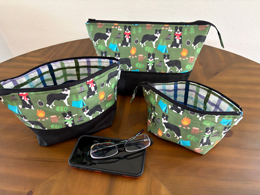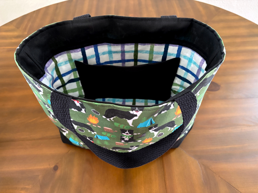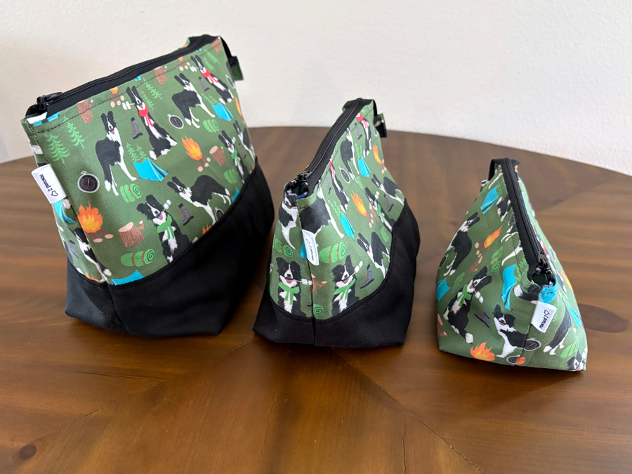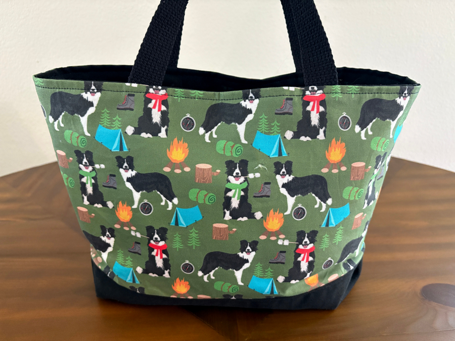 Bring a bit of outdoor Border Collie energy to your personal items – the camping theme is adorable. Hand-sewn with custom printed fabric, this eye-catching set includes an open top Tote Bag with a large interior pocket and fully lined coordinated fabric. Measures 15” wide by 9” tall x 5” deep plus the 5” long cotton web double handles make the bag sturdy as well as attractive.
