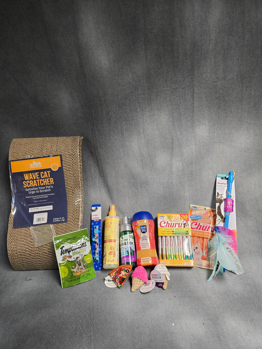 Indulge your beloved fur baby with this collection of premium cat items! This basket is designed to spoil any feline friend, promising hours of entertainment and relaxation. What’s included? -cat scratcher -wand cat toy -one-size collar -litter deodorizer -flea and tick waterless bath -burt’s bees waterless shampoo -3x catnip-filled cat toy -2x churu squeezable treat (24 total) -temptations catnip fever treats -catnip licking treat Basket artists is: Kaytlin Niner