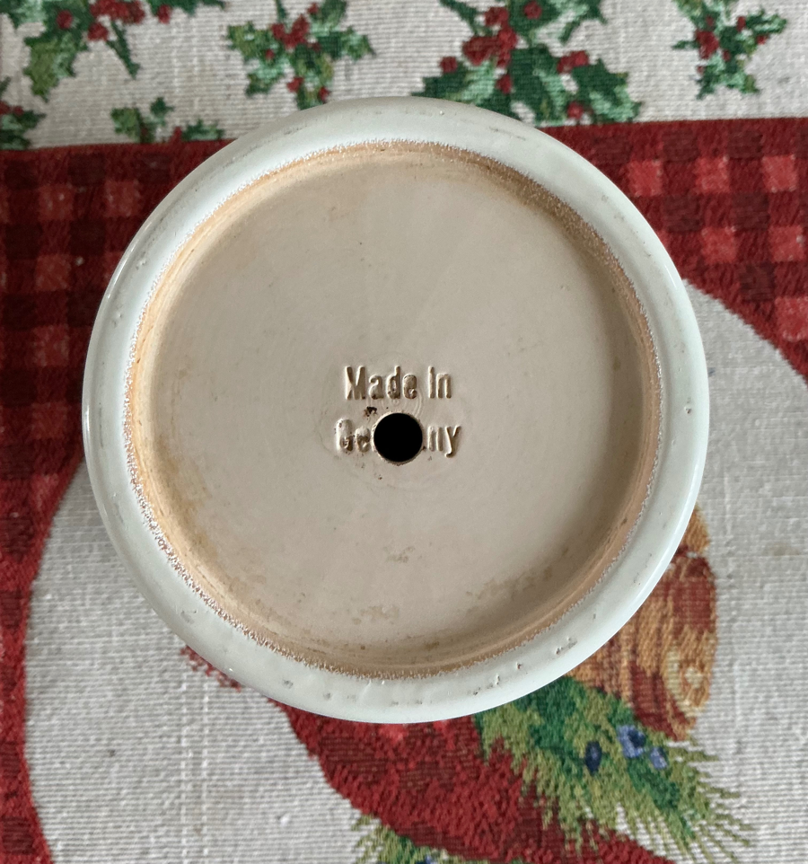 White Ceramic Planter with outside Circular Horizontal Pleats. Measures: Height 6 inches, Width at top 5 3/4 inches, Base 3 3/4 inches. Made in Germany.