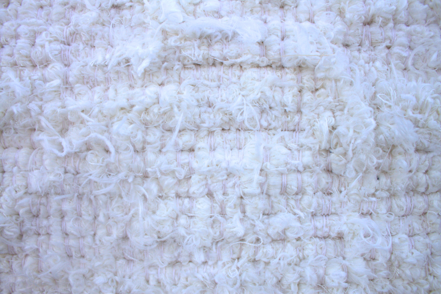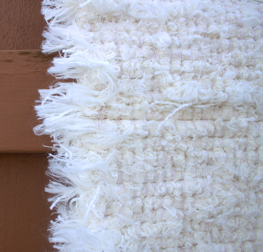 Artist: Mary Moore. "Rug is made from selvedge - a byproduct of the upholstery fabric industry. In weaving with selvedge, it is being kept out of the landfill." Measures 35 x 29 inches.