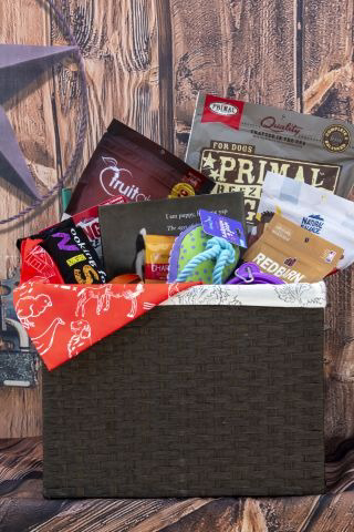 Contains a bag of Primal Dog Nuggets, Natural Balance Crunchy Biscuits, Redbarn Powerfood, Fruitables Dog Treats, Redbarn Rolled Dog Food, Primal Freeze-dried Snacks, Charlie Beer Treats, travel bags, Earth Animal T-shirt, Extreme Kong Toy, Dog Chewy Toy, Dog Bandana, “Animal House Style” book and “I am Puppy, Hear Me Yap” book.