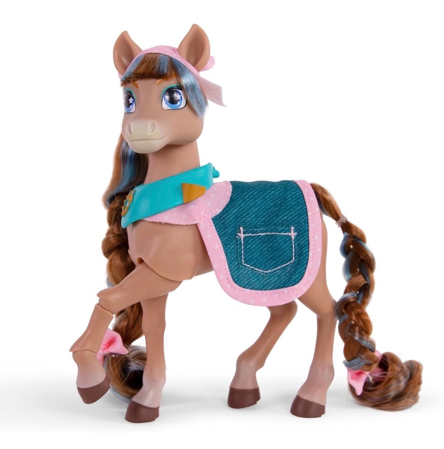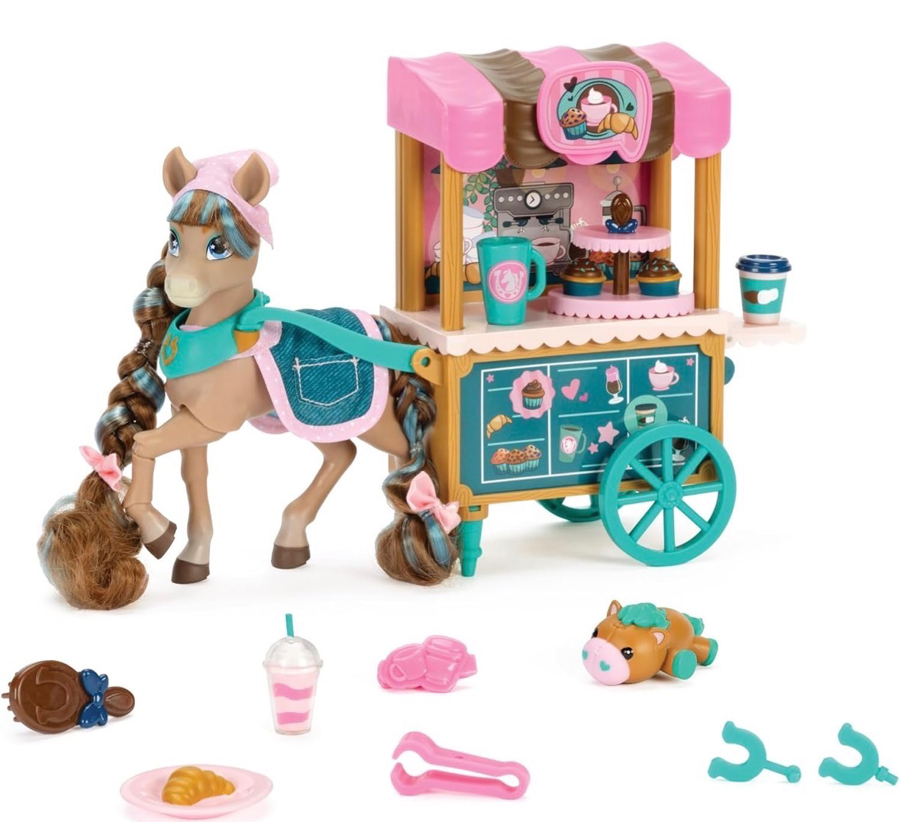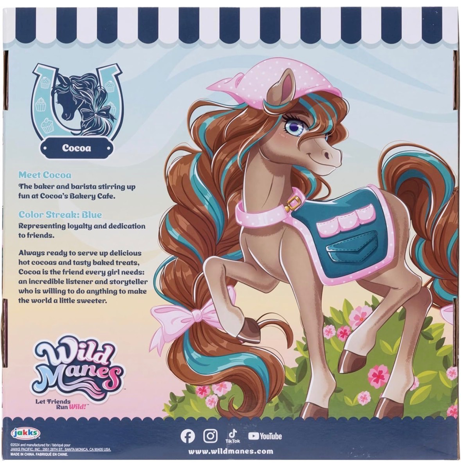 Meet Cocoa, the sweet and loyal Wild Manes horse with her signature blue streak. This fully poseable figure comes with a rolling Bakery Café cart and lots of cute accessories for pretend baking and barista play. Cocoa can “hold” items with her horseshoe‑shaped clips, making interactive play easy and fun.