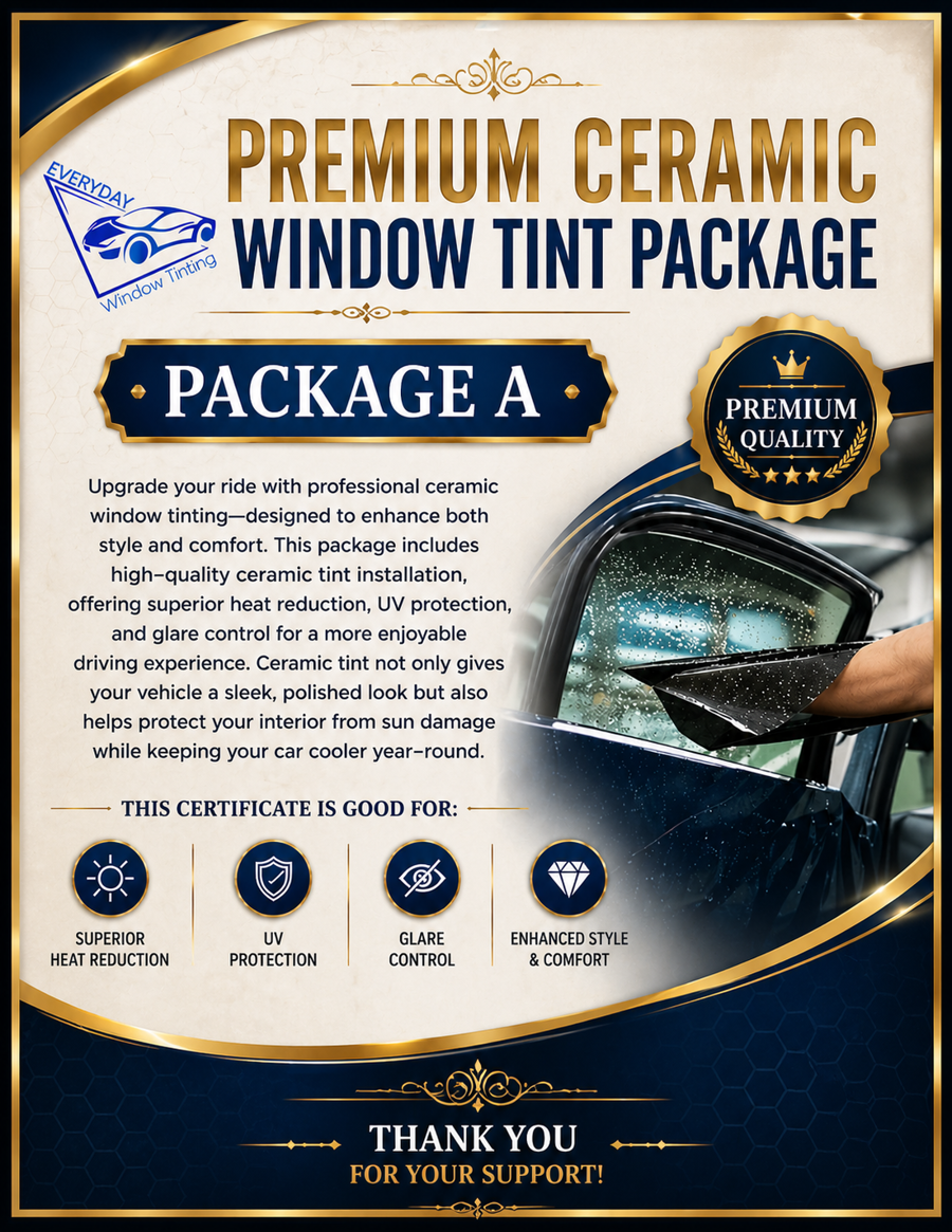 Upgrade your ride with professional ceramic window tinting—designed to enhance both style and comfort. This package includes high-quality ceramic tint installation, offering superior heat reduction, UV protection, and glare control for a more enjoyable driving experience.