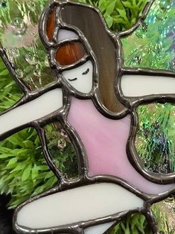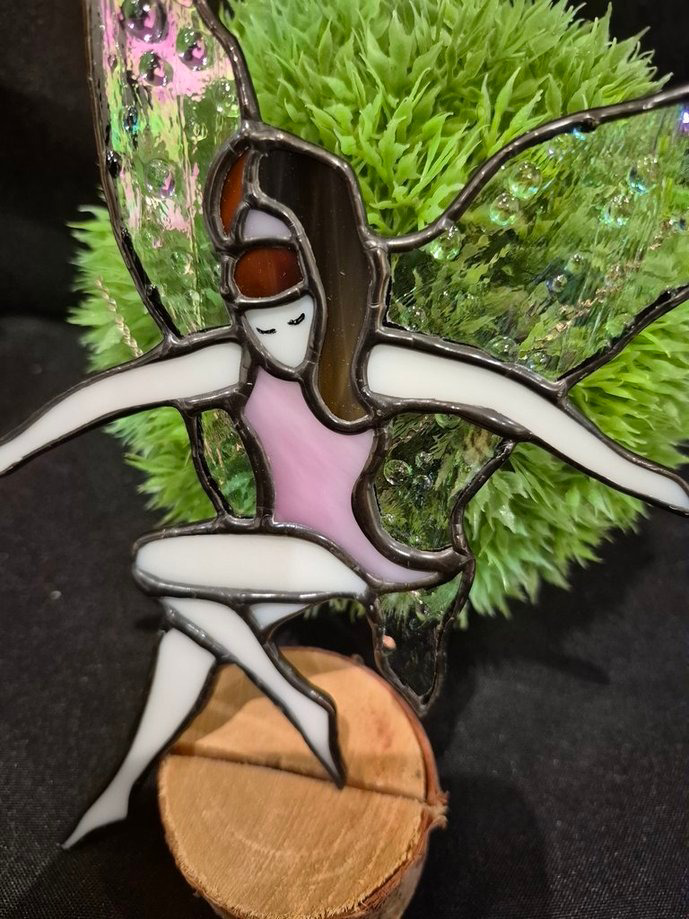 This Handmade stunning stained glass piece titled "Twinkletoes Faerie" has iridescent rainwater wings, pink clothing, and dark hair. It measures 9" in height and a wing span of 6" (approx) with a window suction cup to hang. What started as a hobby has now blossomed into a small stained glass studio in Innisfail Alberta, recognized as one of the Professional Stained Glass Studios in Alberta, by the Spectrum Glass Company Inc.