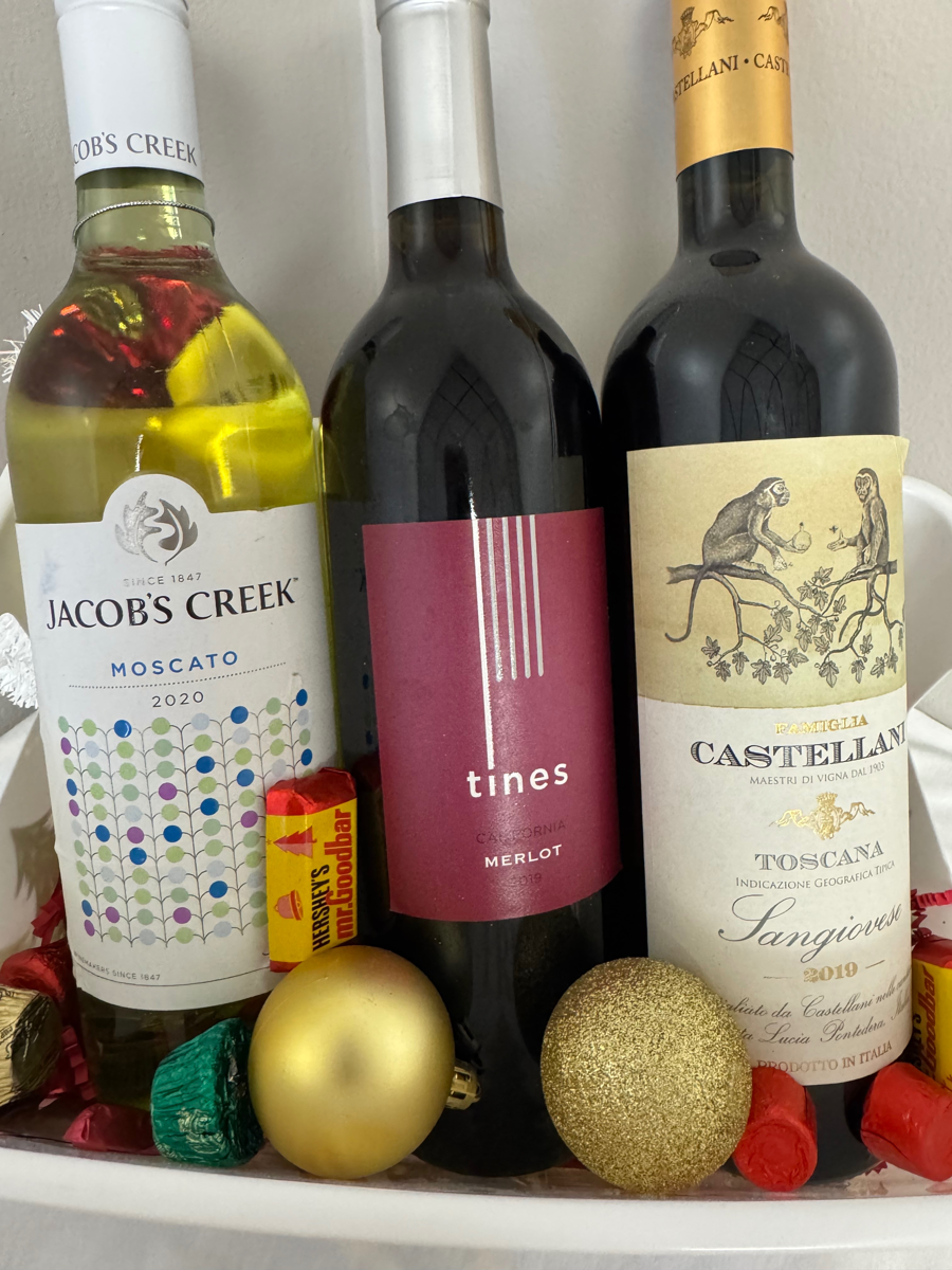Enjoy 3 fantastic bottles of wine. A bottle of Jacob's Creek Moscatos, Tines Merlot, and Famigli Cstellano's Toscana Sangiovese.