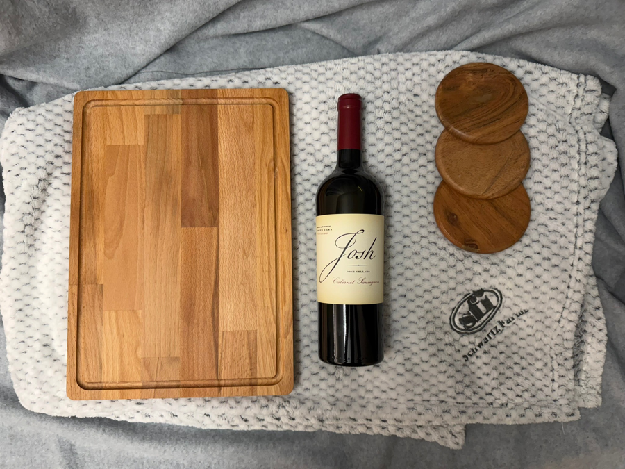 Enjoy a cozy night with this Wine & Dine Bundle from our friends at Schwartz Farms Inc. Included: Blanket, Cutting/Charcuterie Board, 3 Wooden Coasters, and a Bottle of Wine.