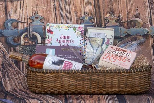 Contains bottle of 2024 Hawk’s Shadow Winery Belle Rose, Wine Smarts wine game, set of wine coasters, 2 hand painted wine glasses, wineglass charm set and “Jane Austin’s Table” book.