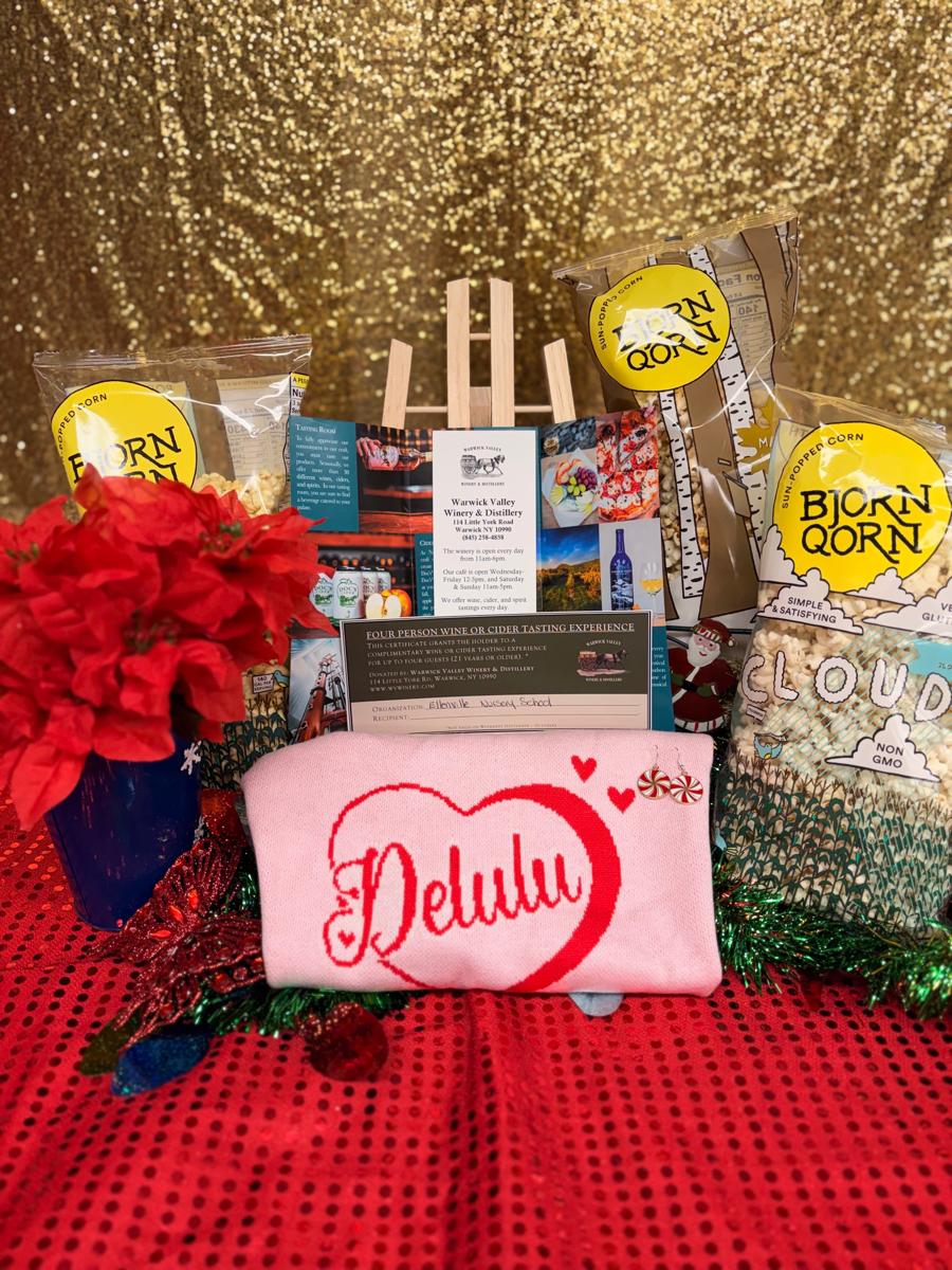 This is a 4 - person wine or cider tasting experience at the Warwick Valley Winery & Distillery and along with this bundle is a "Delulu" sweater and 4 bags of Bjorn Qorn!