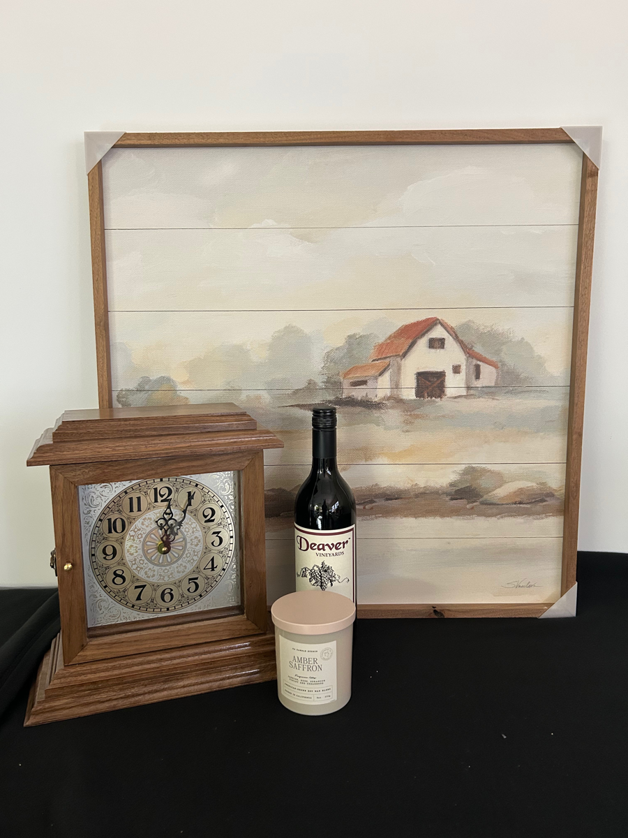 Bring charm, warmth, and a touch of elegance to your home with this rustic-inspired collection. Includes: • Barn picture • Amador County Deaver’s Blend wine • Handcrafted clock • Candle A perfect set for gifting or adding a cozy, rustic touch to any space.
