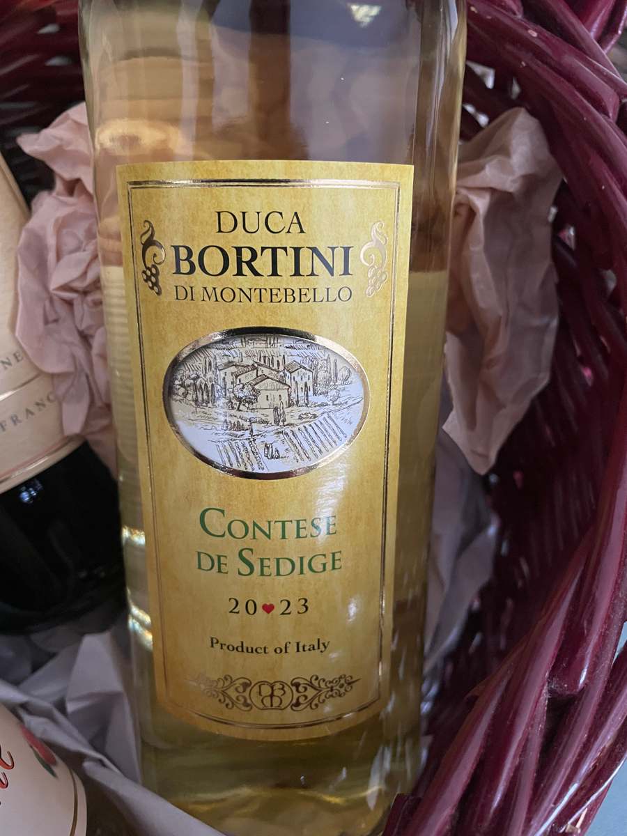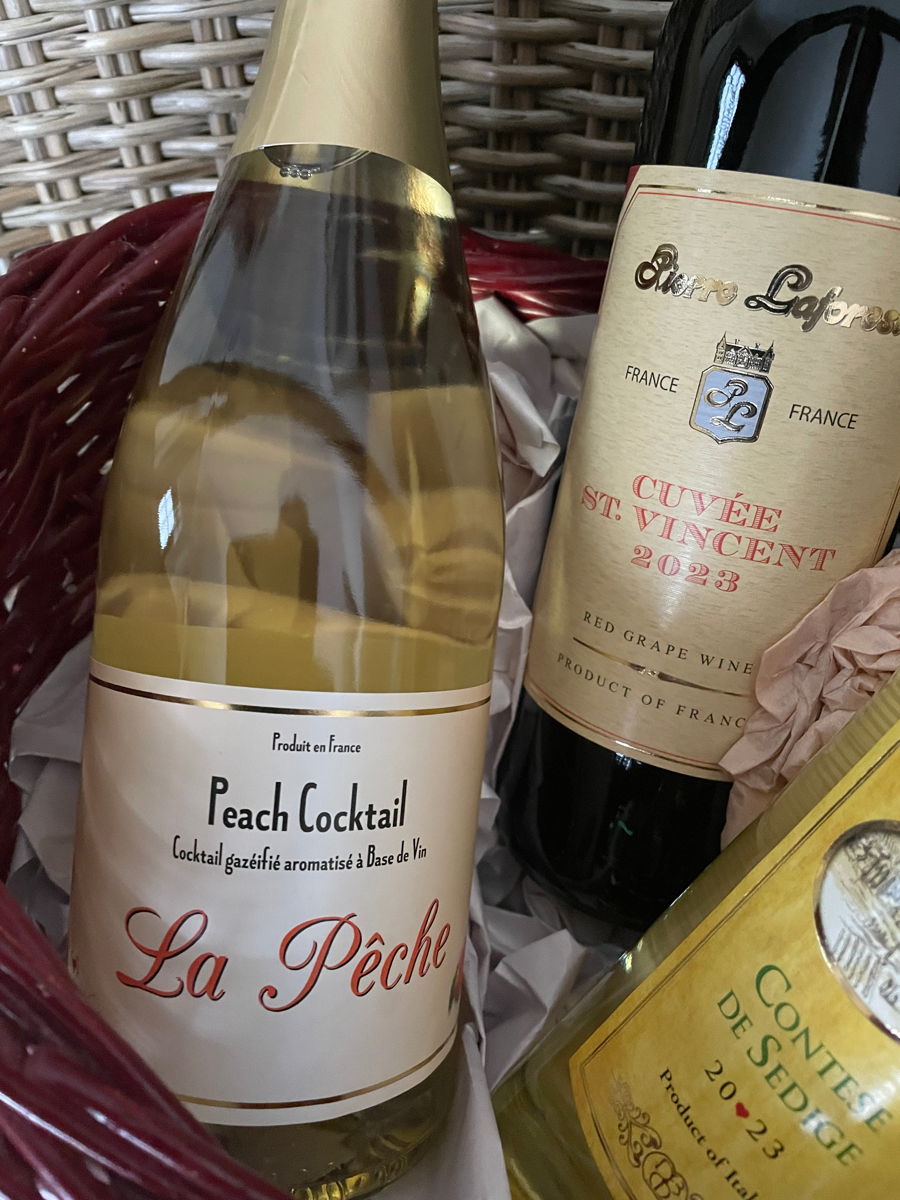 Excellent Quality Wines from Wines for Humanity. Pierre LaForest- Savory and Classic Red Grape Wine- Cuvee St Vincent 2023 product of France, DUCA BORTINI DI Montebello Contese Di Sedige sweet white wine. 2023 Product of Italy, PEACH COCTAIL La PECHE Product of France. Also includes a Metal Cork Bottle Topper Stopper.