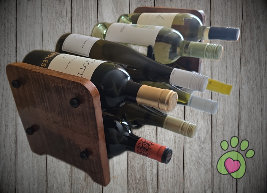 Wood and metal wine rack. Holds up to eight bottles of wine. Includes various wines.