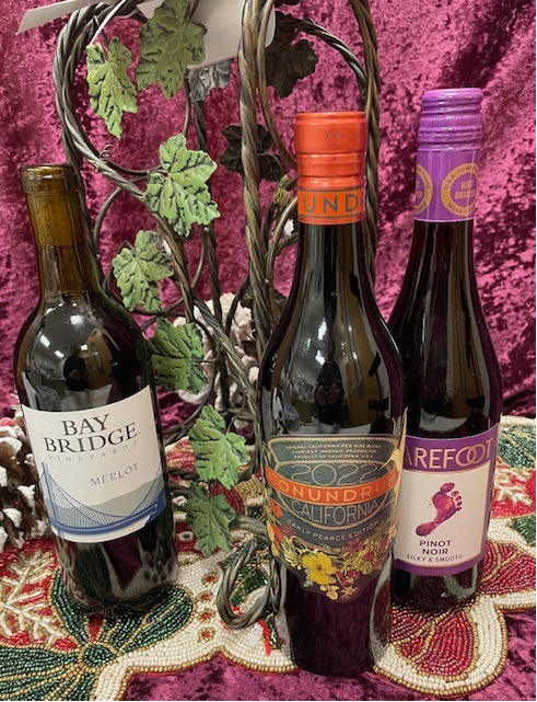 #1070 - Winery Wonders - For those evenings of wonder and relaxation at home! Includes a bronze 3-spot heavy wine rack with ornamental green grape leaves and (3) bottles of special wines. 1-Bay Bridge Vineyards Merlot, 2-Barefoot Pinot Noir and 3- Conundrum California 2022 (Carley Pearce Edition). Rack is gently used/Wines are NEW / Not redeemable for cash. **Must be age 21 + to purchase / present ID upon winning.