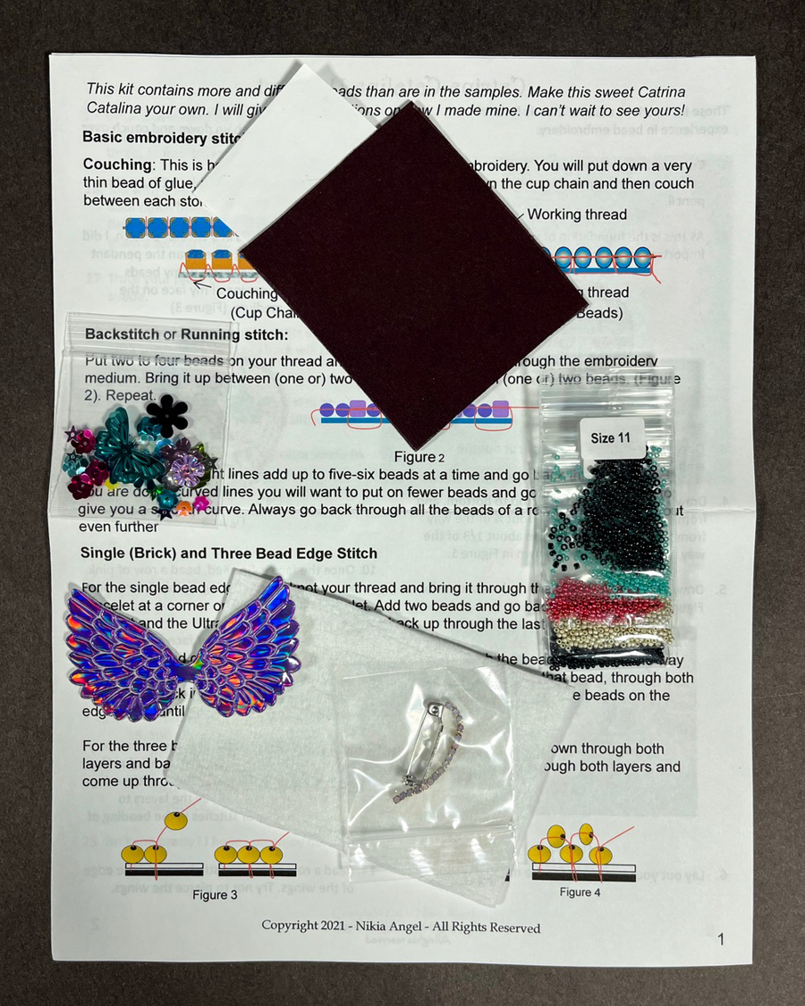 This adorable little brooch or pendant is a show stopper! Fun project makes up quick. I love wearing it on my shoulder. Using basic bead embroidery stitches you will create this charming brooch or. In the kit you will receive enough materials to complete the project. The kit contains a set of holographic angel wings,, a collection of sequins, Japanese seed beads in a variety sizes, Rhinestone cup chain, Embroidery Medium, UltraSuede or metallic leather, and pin back. You will receive full instructions with design instructions and pictures. You will need sharp embroidery scissors, E-6000, white gel pen or pen, needle and thread.