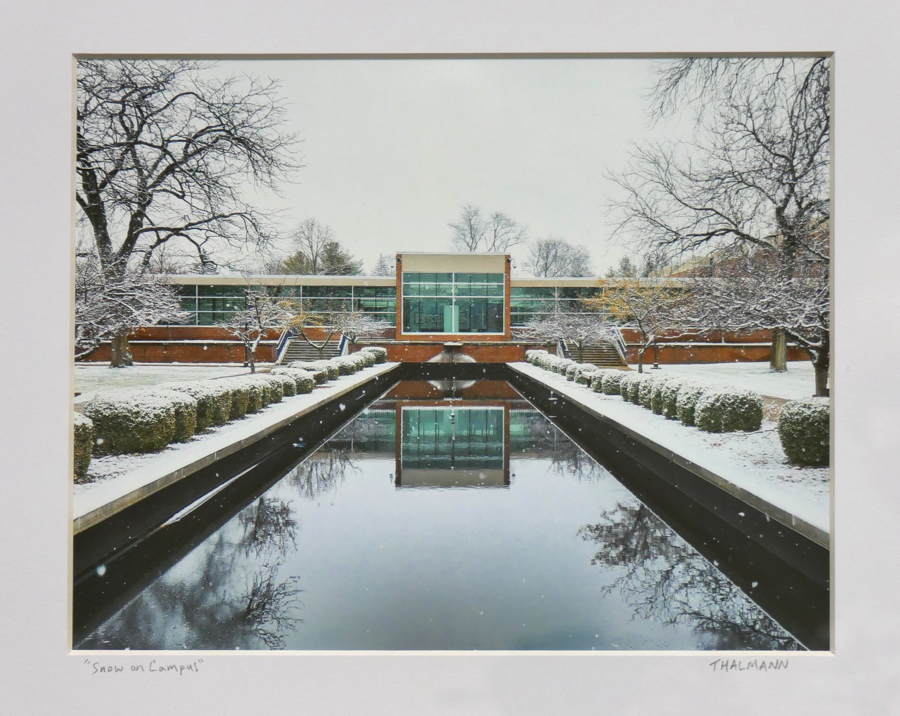 This stunning framed photography captures the serene beauty of the Reflecting Pond during a winter scene at KCC Campus. The original photo, expertly matted, is presented in an elegant 11x14 frame, showcasing the tranquil reflection of the snow-covered landscape.