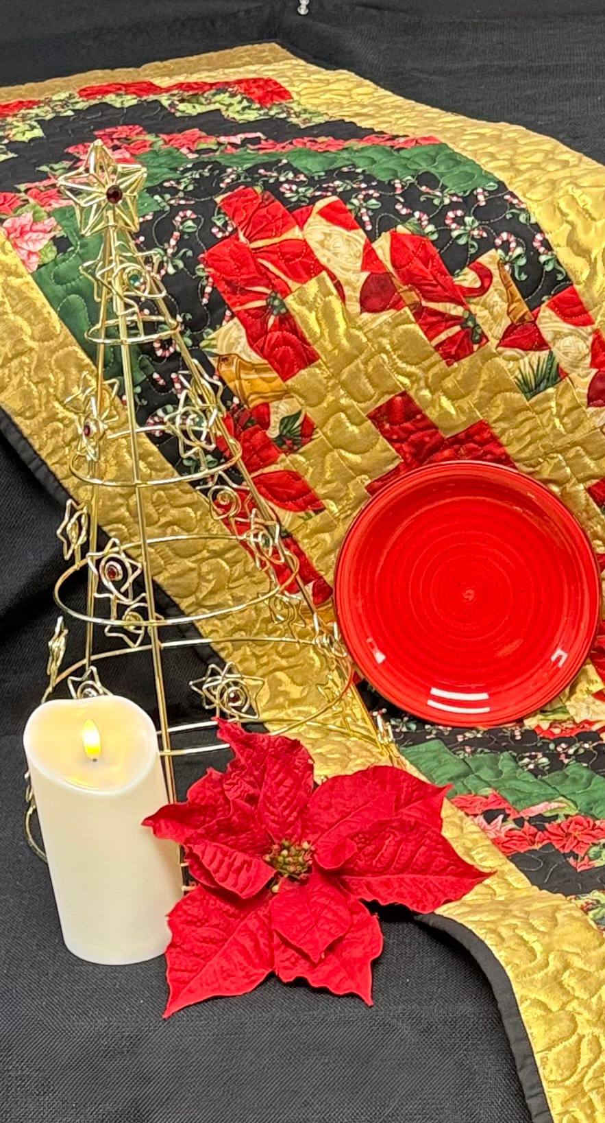 Donated by Colleen Mau This handcrafted Christmas table runner is the perfect addition to your holiday decor. Measuring 64 inches, it goes very well with a stunning metal gold color tree that adds a touch of elegance to your festive table setting. Accompanying this beautiful runner is a charming red plate that showcases a flameless candle, creating a warm and inviting ambiance for your gatherings.
