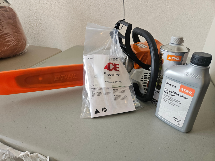 Gift set includes (1) Stihl MS162 Chainsaw 16" bar; (1) quart Stihl Moto Mix; and (1) quart Stihl Bar Oil