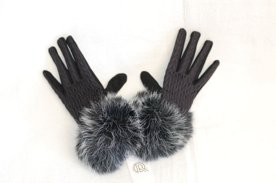 These fashionable black gloves are warmly lined inside and have sylish stretch stitching on the back with black frosted faux fur around the wrist.