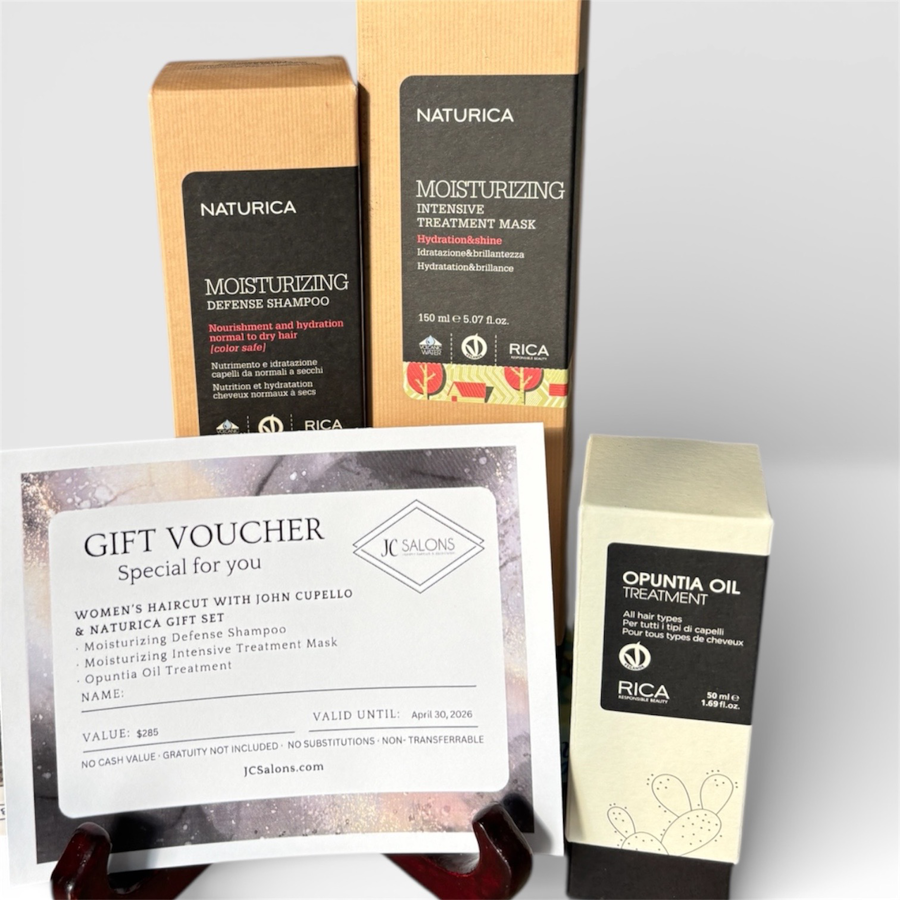 This package includes a Women's Haircut with John Cupello at JC Salons. After your appointment, continue the salon-quality care at home with a Naturica gift set of 3 premium hair treatment products designed to nourish, strengthen, and shine.
