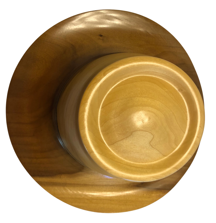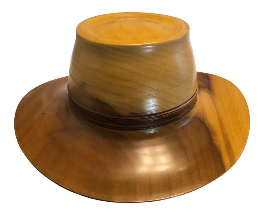 This is a stunning wood turned cowboy hat made out of one piece of wood! It measures 13" wide and it 5" tall.