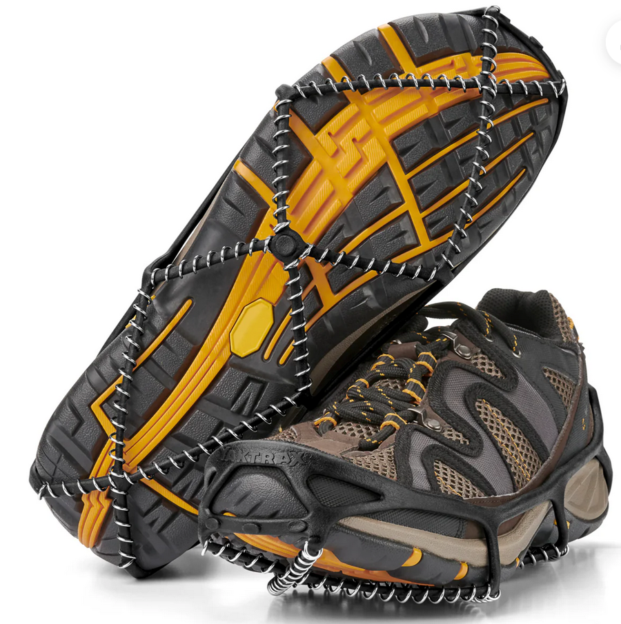 When the snow flies, the Yaktrax Walk traction cleats are like tire chains for your feet. Slip them over your shoes for a stroll around town and don't worry about winding up on your butt. There are unused, in the original packaging, donated by a WAKE member. Size medium fits men's 9-11 shoes or women's 10.5-12.5.
