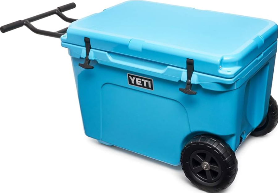This extra large Yeti cooler in Blue comes with Wheels, and will keep your food or drink cool for days. It also includes a bunch of Gatorade and other Various drinks to get you started.