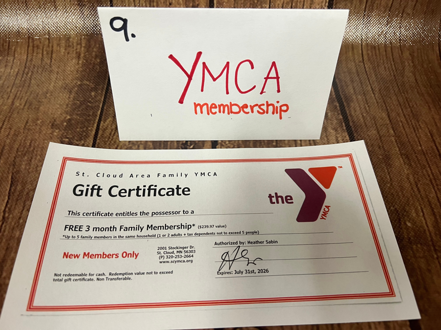 3 month family membership to the YMCA- (exp. 7/31/26) *up to 5 family members in the same household (1-2 adults+ tax dependents, not to exceed 5 people)