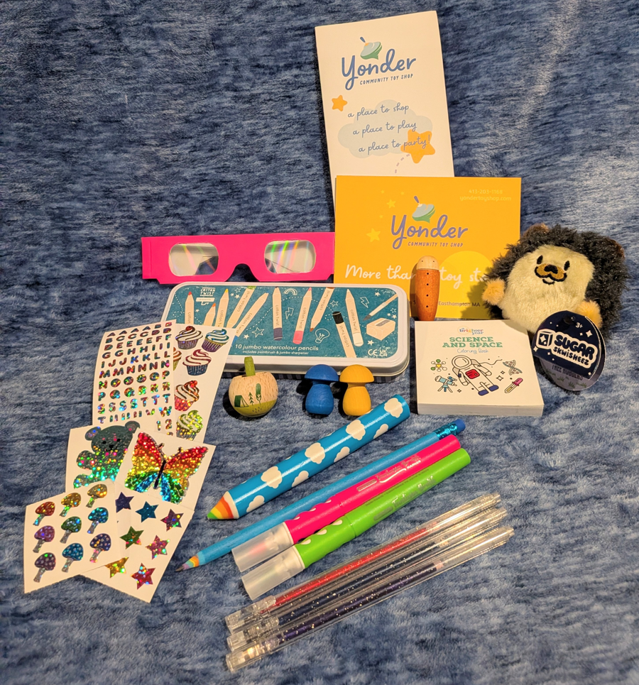 Auction Item: Yonder Community Toy Shop Mystery Bag & a Drop-in-Play Seed Card for 3 times Mystery Bag includes: Watercolour Pencils, stickers, markers, glitter pens, 3 classic wooden toys, wooden spinning top, square coloring pad, rainbow vision glasses and a Sugar Skwisheez. Donated by: Yonder Community Toy Shop Play brings us together - in the garden, by the stream, among the trees. At Yonder we believe that nature and playtime go hand-in-hand, for kids of all ages - even the young at heart! We are a diverse family and feel it is crucial to show up and contribute to our community. We hope to share our passion for play and nature with our neighbors and become a reliable source of support for local families. Play Time Our drop-in play studio is best suited for kids ages 5 and up but flexible for all ages. We provide the space and the tools our members bring the magic. Toy Shop Our collection is inspired by the natural elements and our instinct as humans to learn through play and share stories. Find gifts, treasures and new friends! Celebrations Everyone deserves to be celebrated for the whole, beautiful beings that they are! Let us help you celebrate!