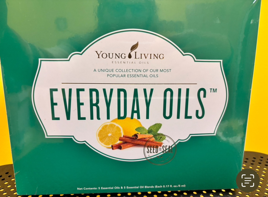 Everyday Oils™ is a great introduction to the many benefits of Young Living’s 10 most popular essential oils. The oils and blends in this select collection provide ongoing support for your home, health, and body. The Everyday Oils Collection includes: Five essential oil singles: Frankincense, 5 ml Lavender, 5 ml Lemon Vitality™, 5 ml Peppermint Vitality™, 5 ml Tea Tree, 5 ml Five essential oil blends: Joy™, 5 ml PanAway®, 5 ml Purification®, 5 ml Stress Away™, 5 ml Thieves® Vitality™, 5 ml