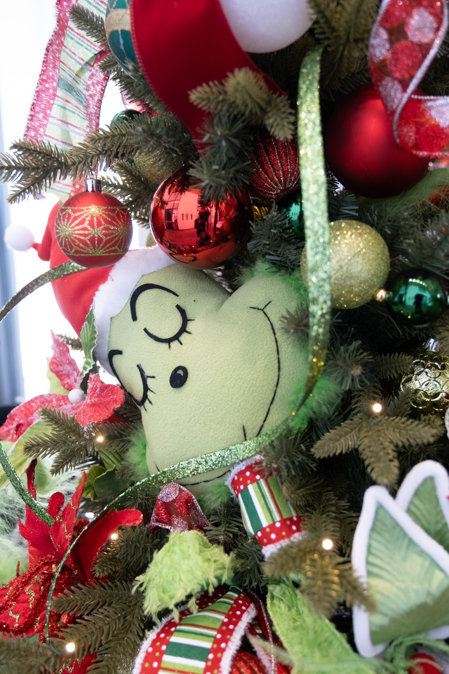 The Grinch has a reputation for ruining Christmas, but this tree won't ruin anything. A smiling Grinch face is featured, along with spindly arms and legs and various colorful ribbon. Red and green bulbs that glitter and shine bring the tree to life, along with a whimsical red topper with playful glitter bulbs and peppermint candies. This tree has pre-lit white lights and measures 64" tall X 24" wide.