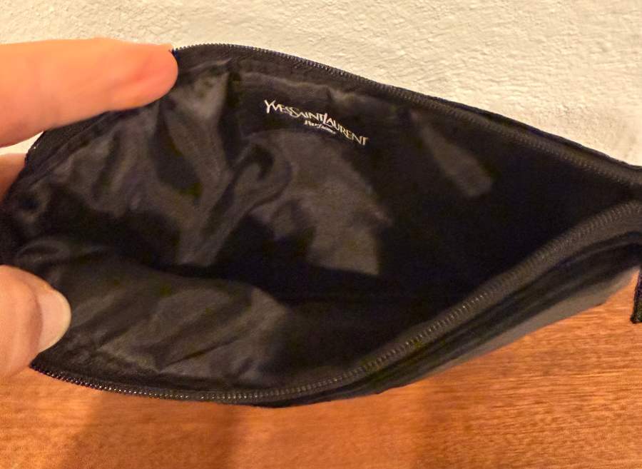 YSL black velvet clutch with silk inset with a zipper closure. YSL is stitched on the exterior with an inner silky liner. It would be a lovely addition to your festive wardrope. Color : Black Condition: good, no rips, or worn signs on velvet Size: 8 x 5 inches