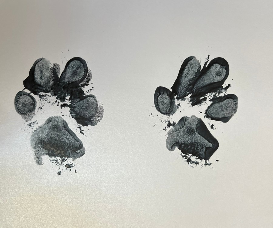 Paw prints from resident mid-content wolfdog Zion on thick paper. Zion was found wandering as a stray in Oklahoma. After his owners failed to claim him he became property of the shelter who quickly realized they needed a more experienced facility to take him in. Wild Spirit was fortunate to find a qualified foster option to get him out of the shelter, and after several months of waiting for an enclosure to open up with us, he was finally able to make the trip here! Fun Fact: Zion was bred by the infamous Tiger King's Joe Exotic!