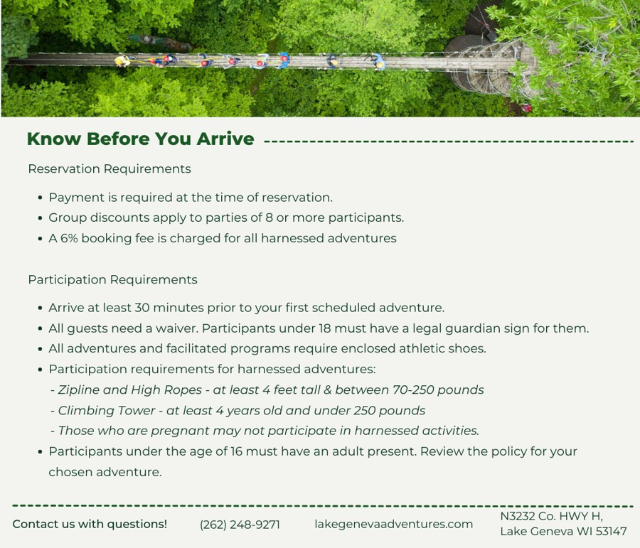 1 - Full Zipline Tour With Lake Geneva Ziplines & Adventures Please see attached flyer for Reservation and Participation requirements!