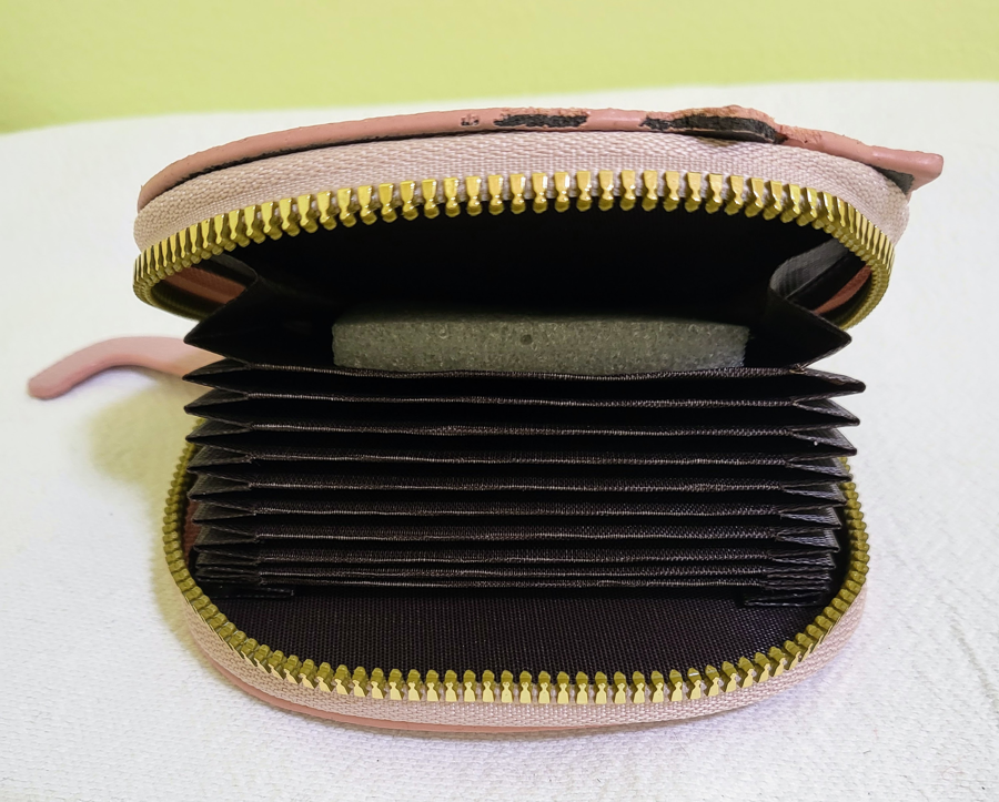 Super cute zippered kitty holds IDs, several cards, and photos. Pink color with moveable tail and decorative face stitching.