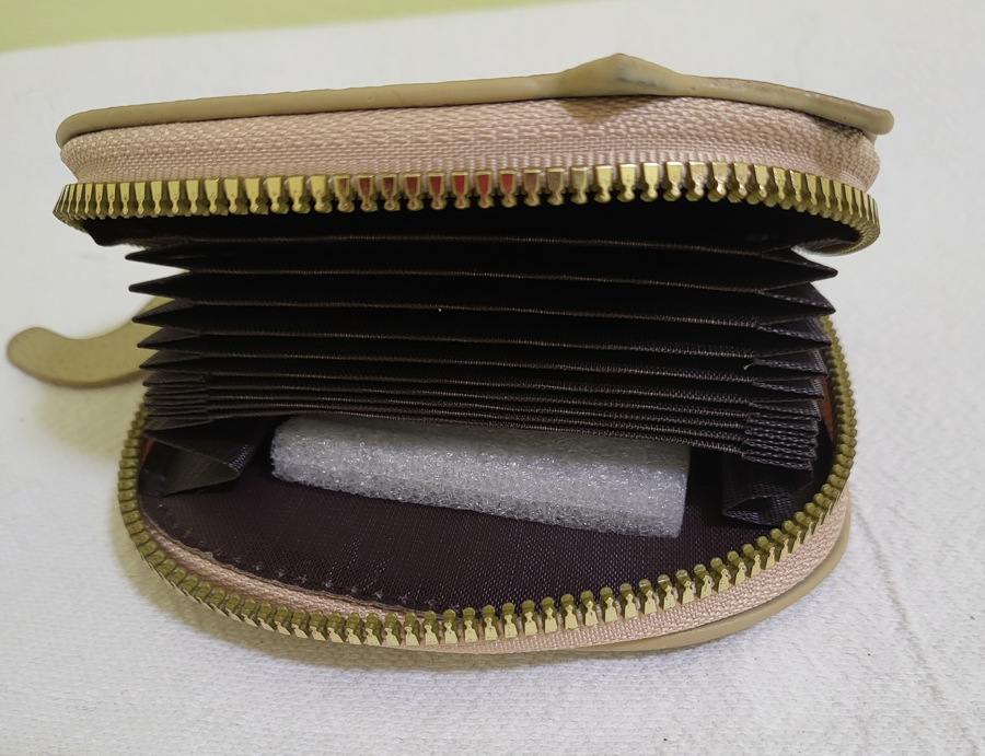 Super cute zippered kitty holds IDs, several cards, and photos. Gold color with moveable tail and decorative face stitching.
