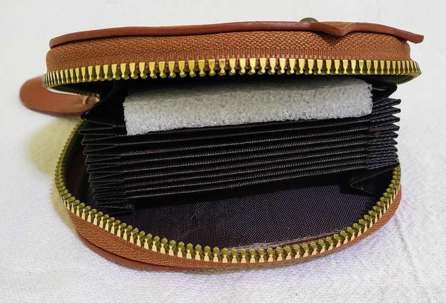 Super cute zippered kitty holds IDs, several cards, and photos. Dark tan color with moveable tail and decorative face stitching.