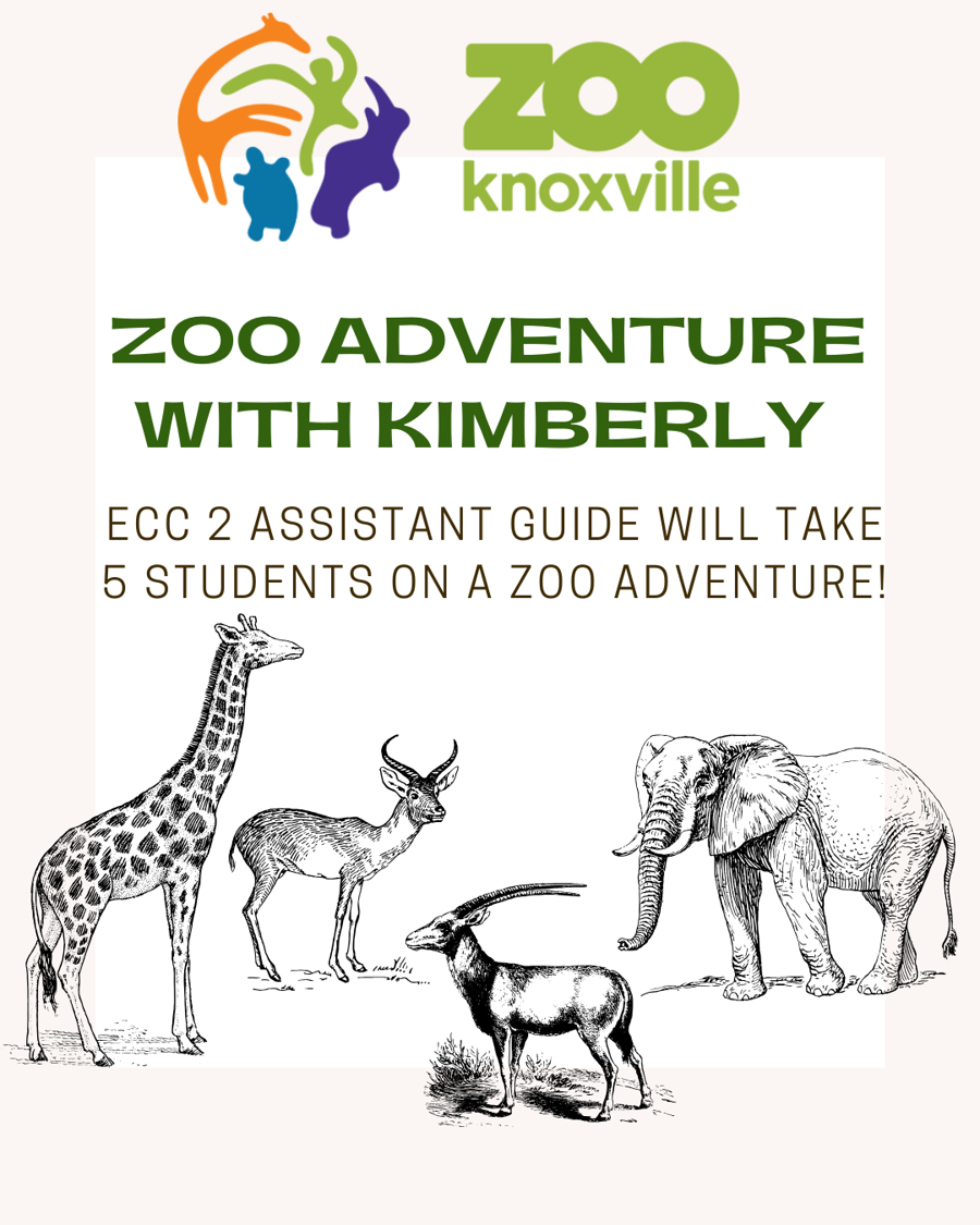 Join Kimberly, ECC2 Assistant Guide for an exciting Zoo Adventure! You will explore the Knoxville Zoo and see a variety of fascinating animals with Kimberly as she guides you through the exhibits. Don't miss this incredible day filled with fun, education, and unforgettable memories at the zoo!