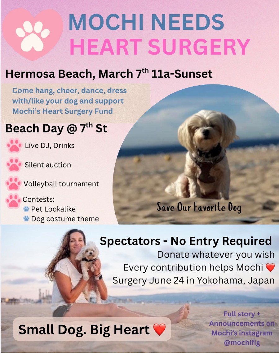 This event and silent auction supports Mochi, my amazing rescue pup. On December 7, 2025, she had her first episode of Congestive Heart Failure (CHF) and was given only 12-24 months to live. I learned about the opportunity for Mitral Valve Repair Surgery, a rare, life-saving open-heart surgery, that would enable her to survive long-term.