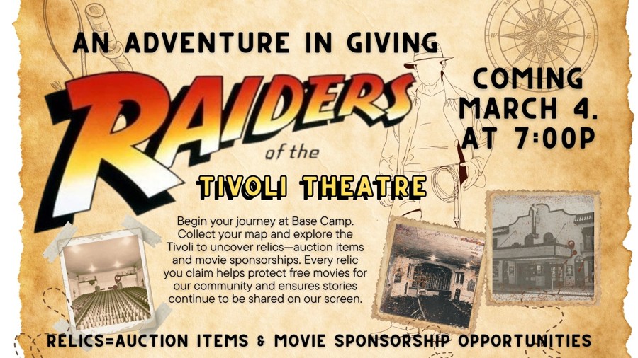 Adventurers, treasure hunters, and movie lovers—your next quest awaits! The Tivoli Theatre’s Annual Fundraiser Silent Auction is online, and the relics (a.k.a. amazing auction items) are ready to be discovered. Your bids help the Tivoli continue offering quality entertainment at affordable prices inside our beautifully historic theatre.