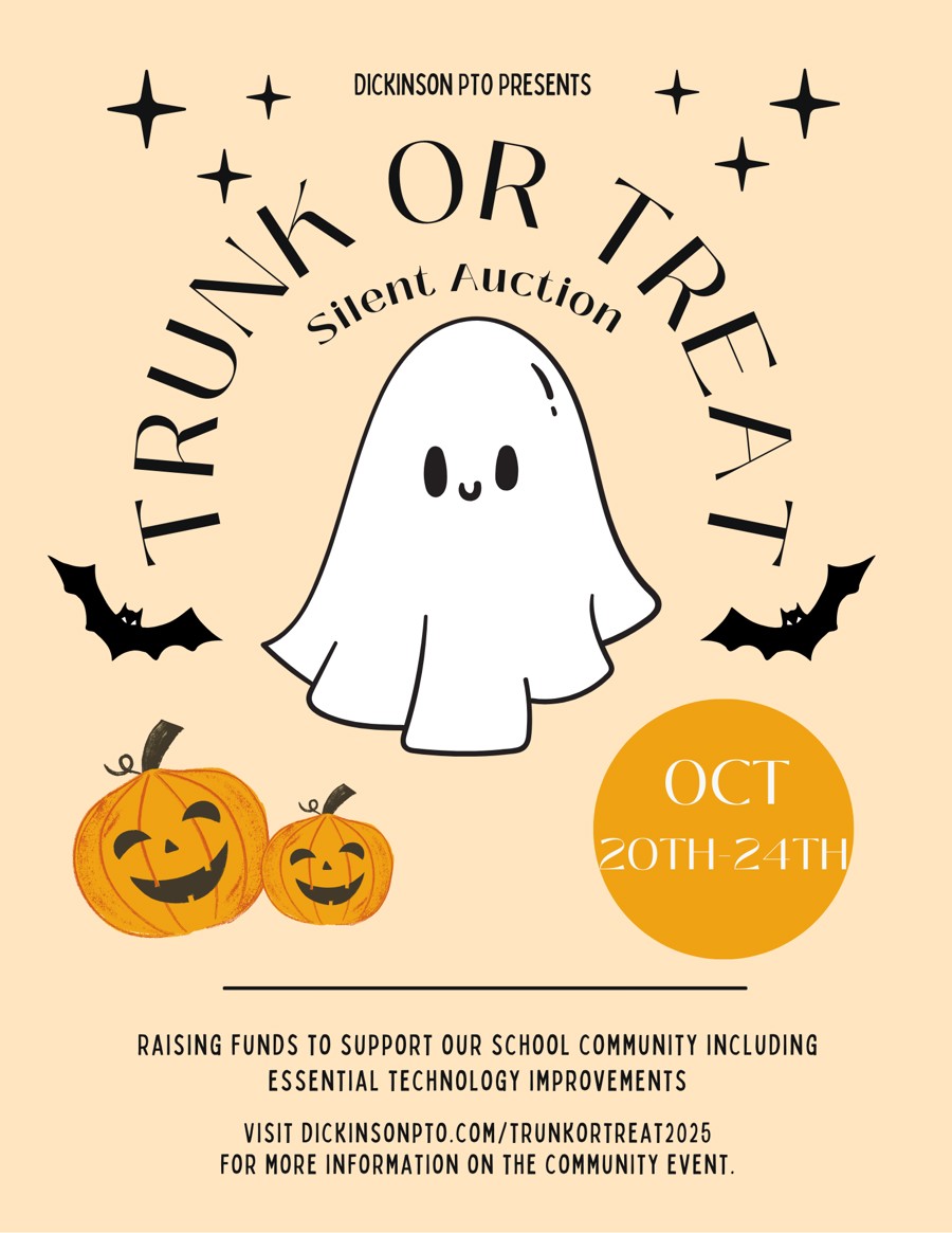 We are so excited for our annual Trunk or Treat Community Event and Fundraiser! We know it will be bigger and better than ever! The event will be held on Friday, October 24th from 5:30-7:30pm at Dickinson Elementary School, but the online auction is live NOW through the evening of the 24th! It will close at exactly 11:59pm that evening!